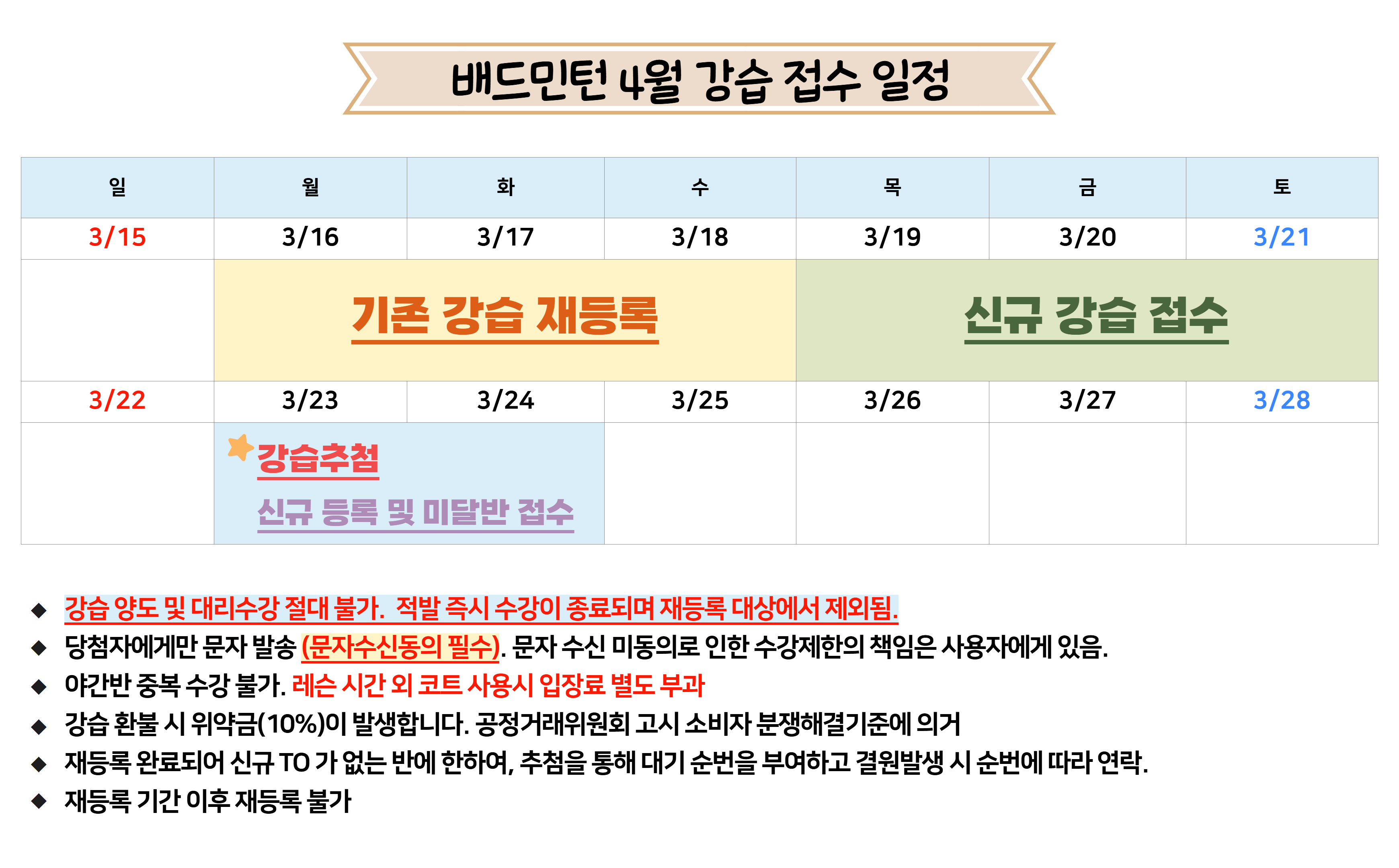※ 신규 강습 추첨일: 3.23. (월) 오전 10시, 당첨자 개별통보(문자연락)